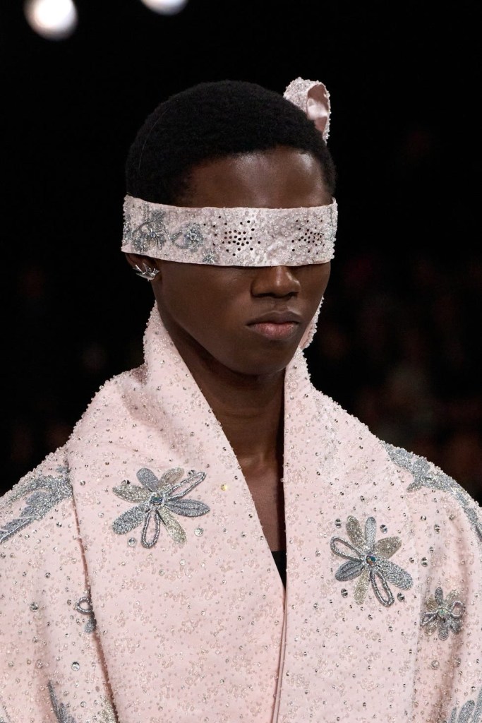 這款大衣靈感源自 1984 春夏高級訂製系列「Pondichéry」,以精緻的刺繡圖樣呈現過往 Dior 女裝的優雅風華,並藉由極簡俐落的男裝輪廓,使其展現嶄新的當代氣質。而秀場上出現的各式面具,也同樣來自這一系列的靈感轉化,將 Dior 高訂歷史轉化為更具現代感的細節語彙。