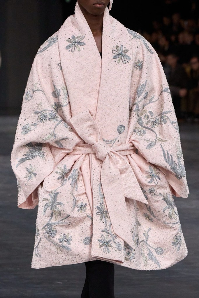 反覆出現的長袍和大衣中,靈感大多來自Dior女裝典藏檔案,絲綢與緞面的選料盡顯奢華,Kim Jones透過剪裁帶回「陽剛」氣質,俐落、簡約且稜角分明的版型,給人一種嚴謹又莊重的個性。