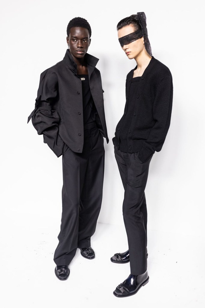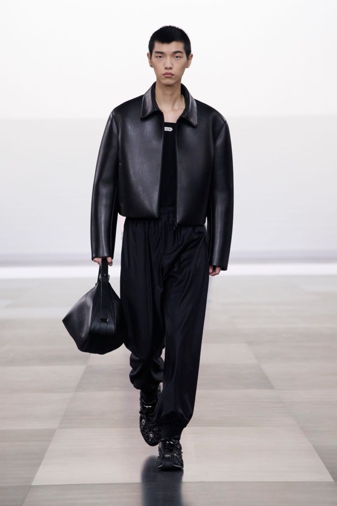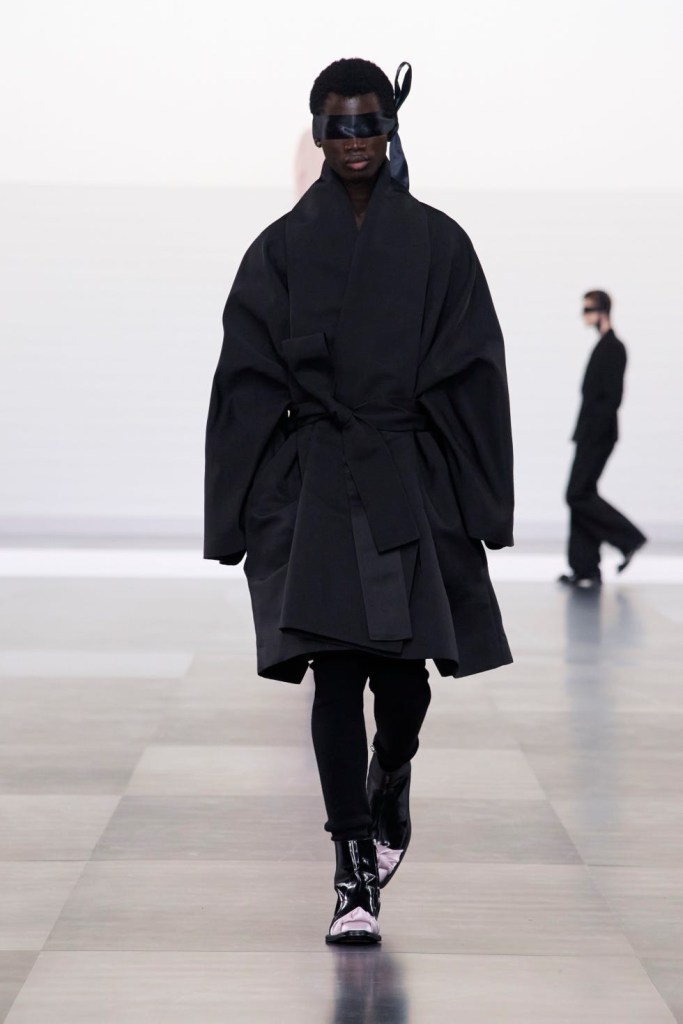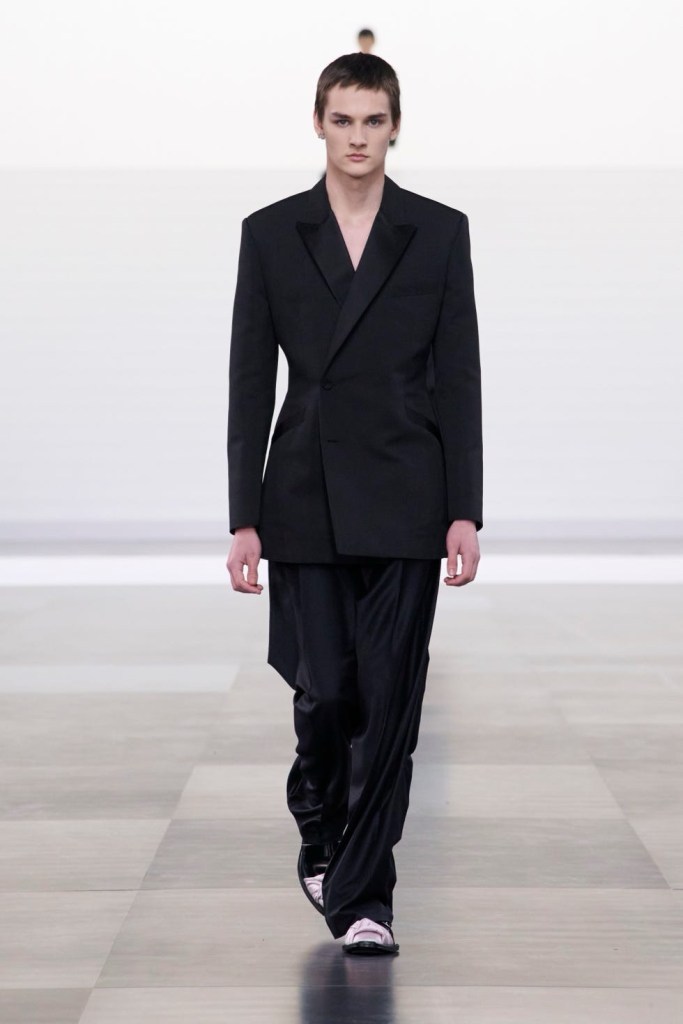 這種極簡的場景佈置,呼應了 Kim Jones 本季的設計理念——將時裝的精髓回歸至剪裁與面料的探索,透過純粹的黑與白,使作品的層次、結構與質感更顯突出。